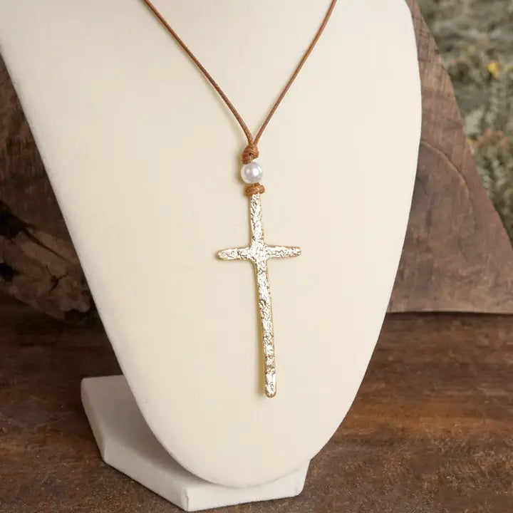 The Primitive Cross Necklace offers a rustic yet refined look, featuring a 3" worn cross pendant with a textured finish. Available in gold tone with a brown waxed rope or silver tone with a black waxed rope, this piece is accented with an 8mm pearlized acrylic bead for added elegance. Ideal for layering or wearing solo as a statement piece. Details: * 3" worn gold-tone or silver-tone cross pendant with textured finish * Available in gold tone with brown waxed rope or silver tone with black waxed rope * 8mm pearlized acrylic bead, knotted * 16" + extender for adjustable length * Lobster claw clasp * Rustic yet refined design, perfect for layering or solo wear