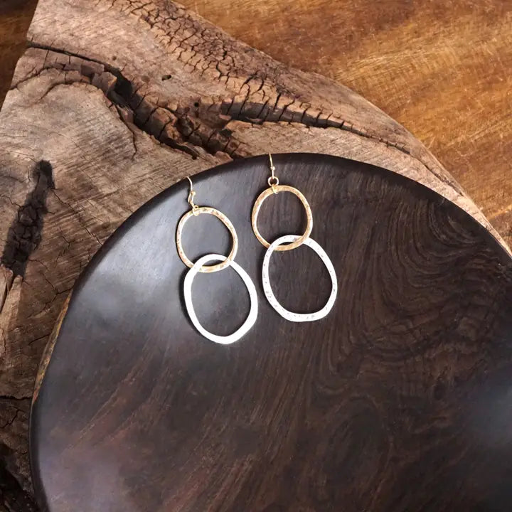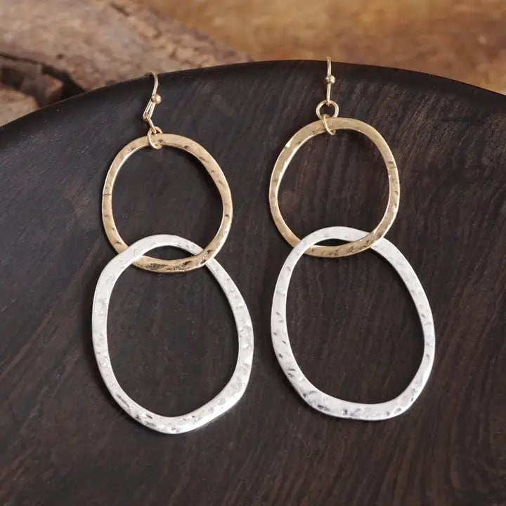 Two-Tone Boho Hoop Dangle Earrings An artful twist on a classic, these asymmetrical hoop earrings bring an effortless boho charm. The mixed metal design—worn gold and silver-tone—creates a versatile, easy-to-style look. Lightweight with a graceful movement, they’re perfect for everyday wear. Details: * Two asymmetrical hoops for a unique, organic feel * Worn gold and silver-tone finish * Fish hook closure for a comfortable fit * 2.25" drop length * Lightweight and easy to style